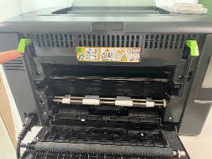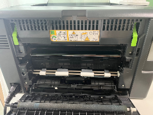 종이를 뺄 땐 저 프린터기 뒷면의 양 옆 위에 있는 초록색 레버를 들어올려준 뒤에 종이를 빼면 된다.