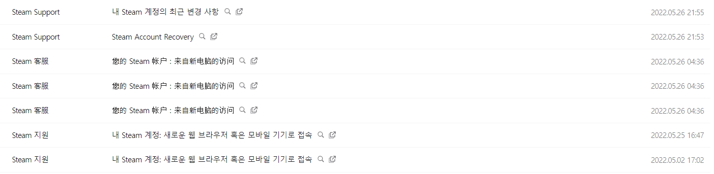 작년에 스팀에서 계속 비밀번호 찾기 하려고 누가 중국에서 다섯번이나 내 계정에 로그인하려고 했는데 절대 못했다