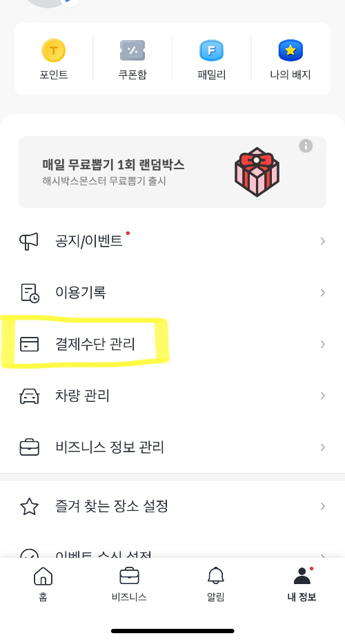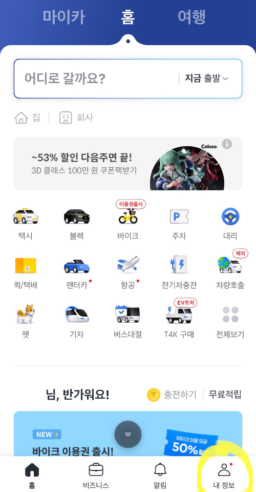 카카오 택시에서 결제수단을 관리하려면 오른쪽 하단에 있는 ‘내 정보’를 우선 누릅니다