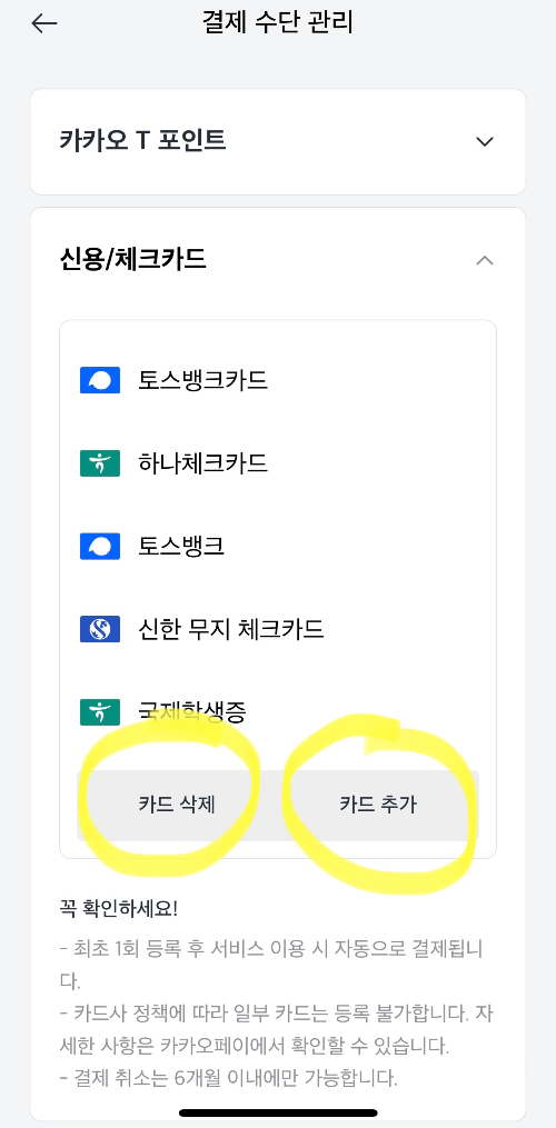 사실 카카오 t는 카카오톡/카카오페이에 등록된 카드들과 연동이 되어있습니다. 카드 삭제 또는 카드 추가를 누르면 카카오톡으로 저절로 이동하게 됩니다. 그러면 카드를 관리할 수 있습니다.