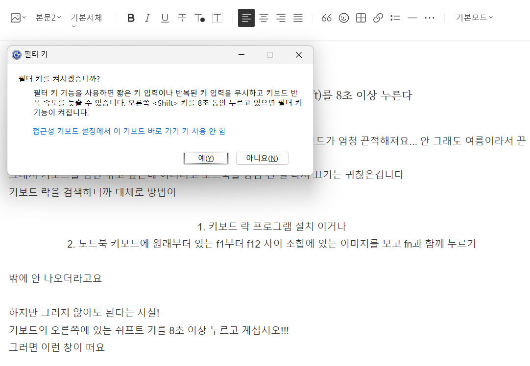 키보드의 오른쪽에 있는 쉬프트 키를 8초 이상 누르고 계십시오!!!