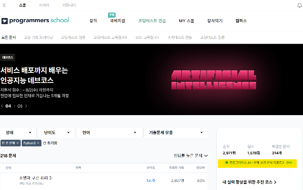 | 프로그래머스 AI 종합 분석 결과(feat. [파이썬] 바탕화면 정리 - 코딩테스트 연습) (2) | 2023.07.31 |