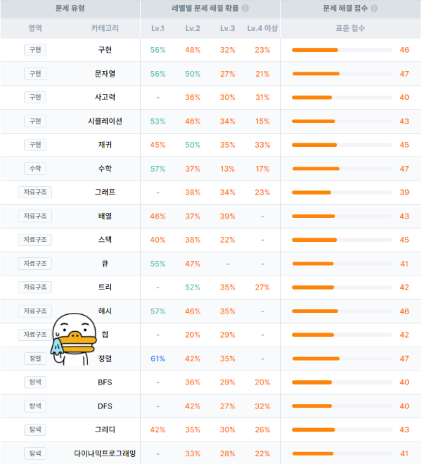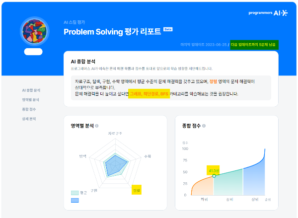 아니... 해결 못한 문제들 위주로 알려주네? 심지어 종합 점수가 하위에 아주 가까운 중위에 걸쳐져 있네? 다음 업데이트까지 5문제 남음???