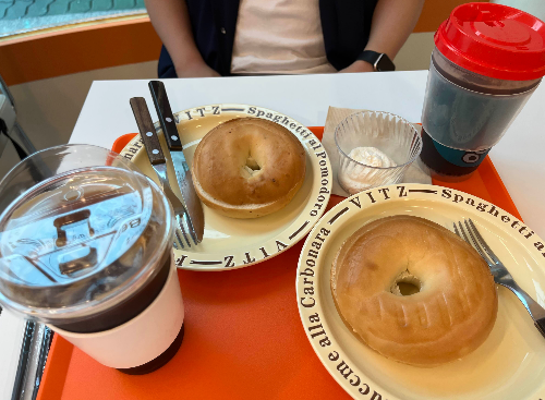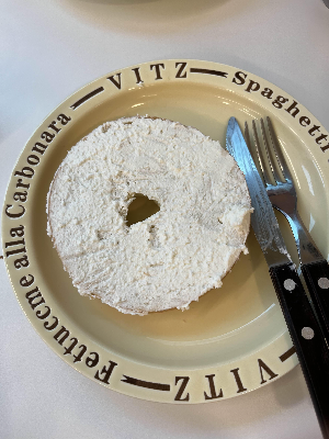 베이글이 두 쪽으로 이미 갈라져서 나와서 칼은 베이글에 크림치즈 바르는 용도로만 사용했습니다