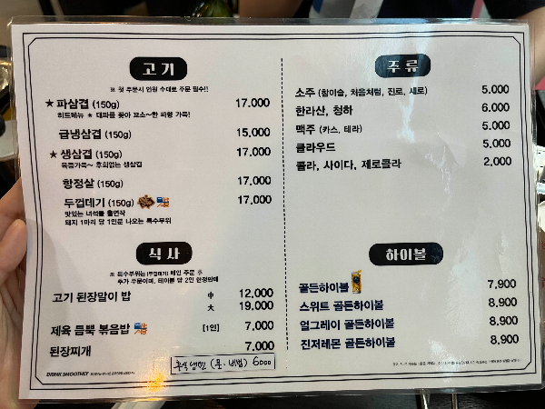 메뉴판! 파삼겹 하나 제육 듬뿍 볶음밥 하나 테라 하나 얼그레이 골든 하이볼 하나 시켰습니다