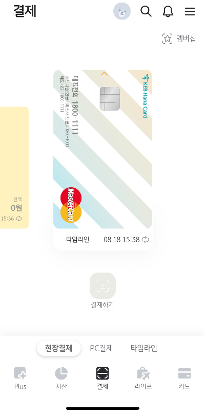 결제 화면에서 오른쪽에서 왼쪽으로 드래그하여 넘기면 등록된 카드가 있습니다.