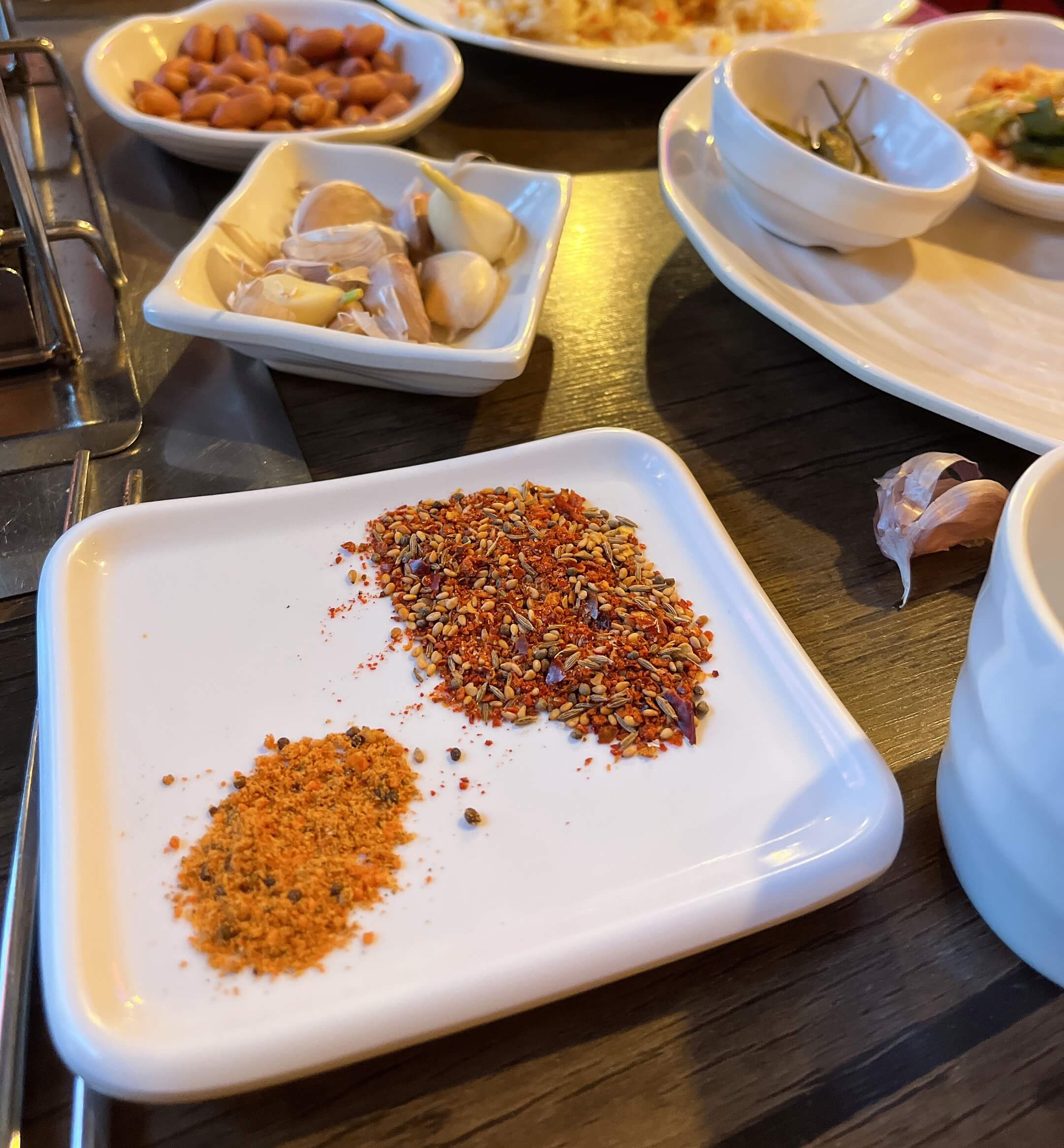 기본반찬으로 나온 땅콩이랑 마늘이랑 양꼬치 찍어먹는 양념