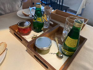 주문이 많이 밀려서 음료 먼저 받았습니다. 직접 청 뚜껑 열어서 페리에도 컵에 담고 수저로 저어 만드는 셀프 에이드예요