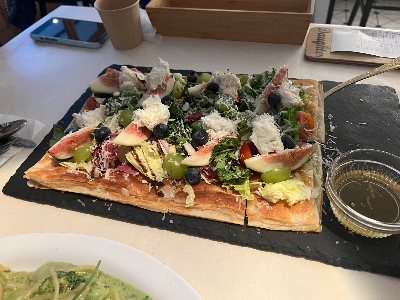 샐러드피자는 사실 피자가 아닙니다. 달달한 빵 위에 올라간 달달한 맛이 많은 샐러드 집합체입니다.
