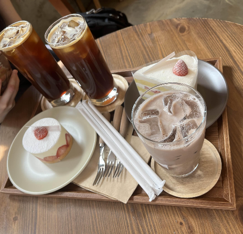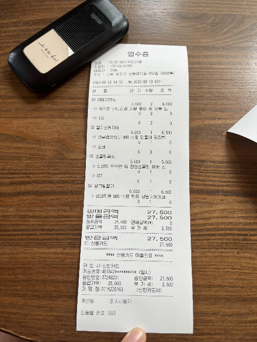 셋이서 아메리카노(4500원) 두 잔, 초콜릿밀크(5500) 한 잔, 딸기프레지에(6500) 하나, 생크림딸기(6500) 하나 시켰더니 27500원 나왔습니다.