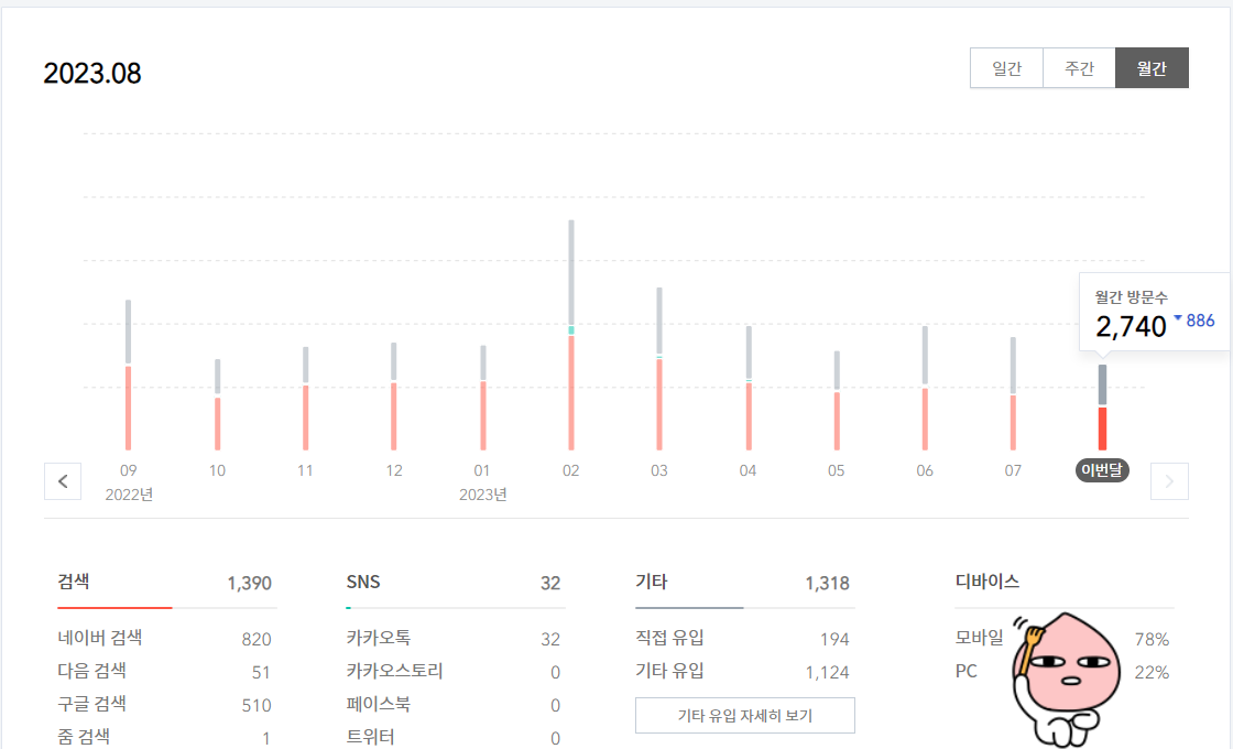 이번달은 모바일이 78%인데 저번달은 모바일이 83%였네요. 평균적으로 모바일이 80퍼센트이기 때문에 모바일 최적화가 시급합니다.