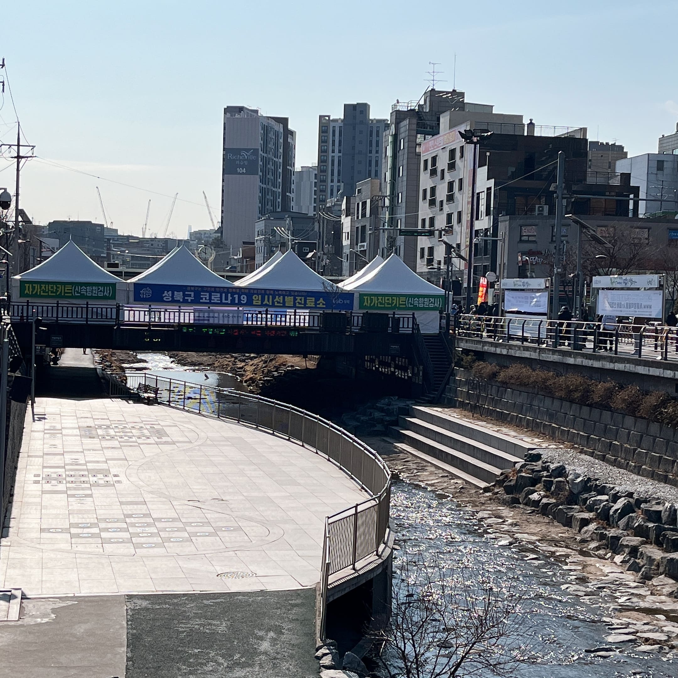 성북구청 바람마당 임시선별검사소는 성북구청 뒷편 성북천 다리 위에 있어요.