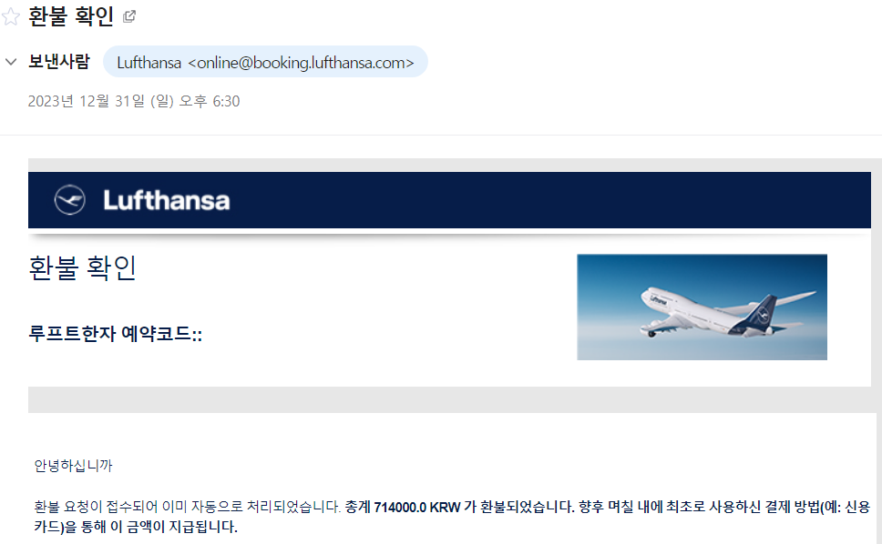 환불 확인 이메일이 왔어요. 돈이 언제 들어오는 지는 앞으로 확인해보겠습니다.