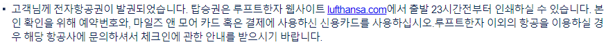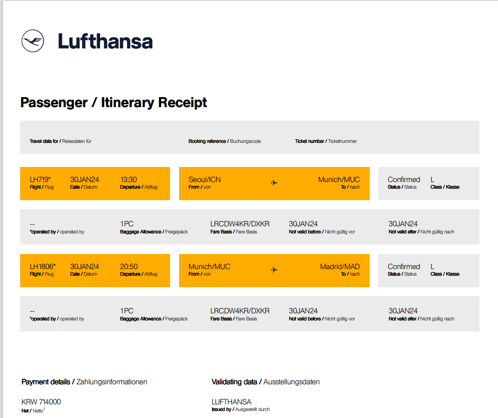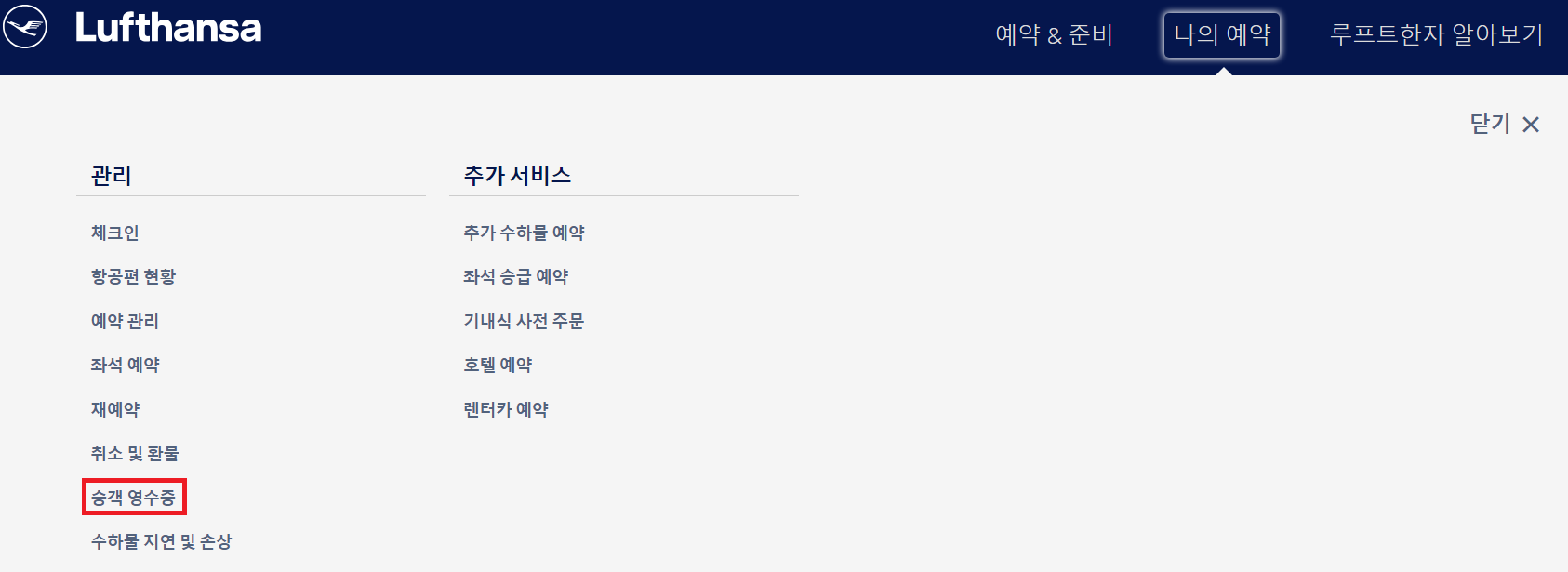 이메일로 예약 확정이 됐다고 오면 이메일에 있는 링크 말고 루프트한자 홈페이지의 '나의 예약'의 '승객 영수증'으로 들어가주세요.