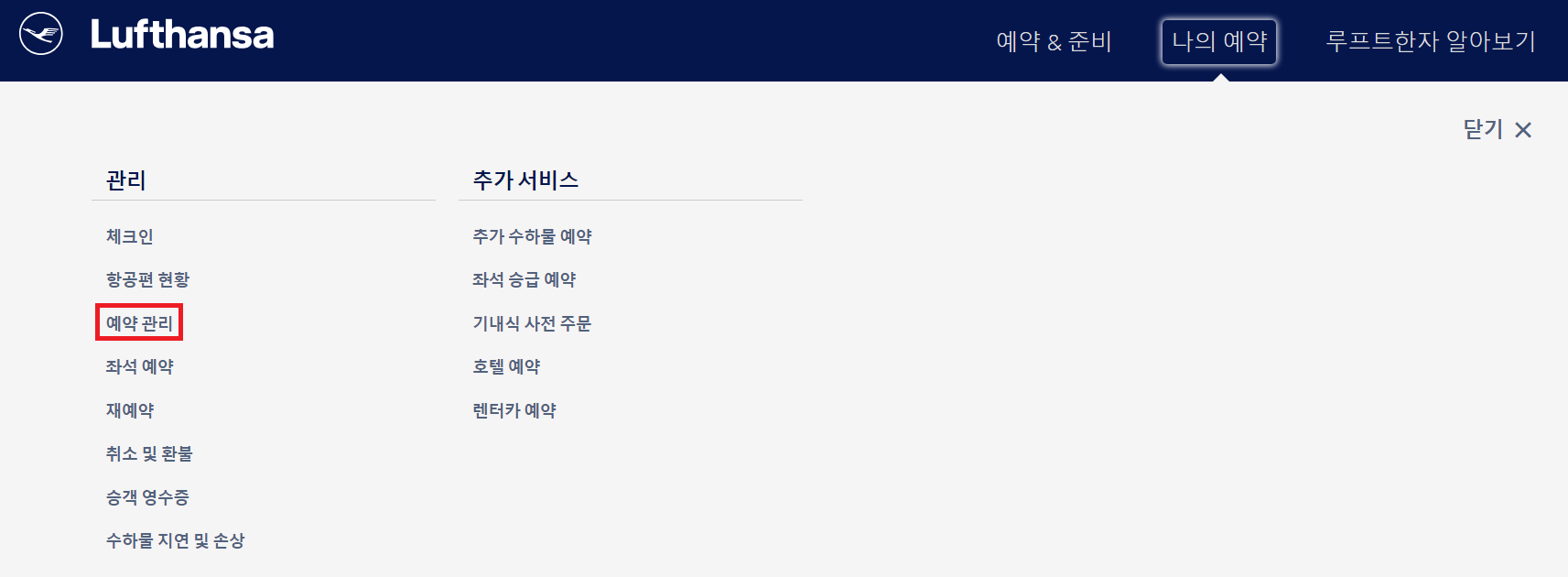 이제 취소를 해봅시다. 루프트한자 홈페이지의 나의 예약에서 예약 관리를 눌러줍니다.