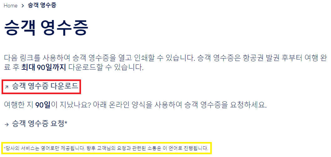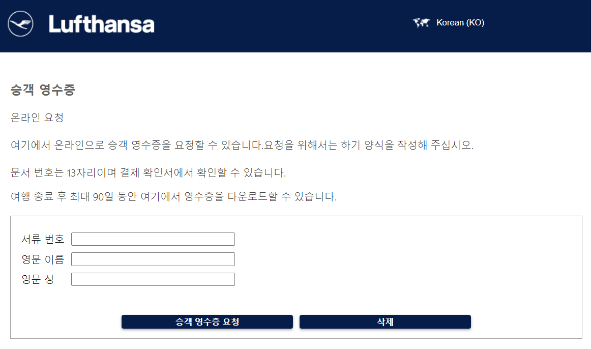 서류번호와 영문 이름, 영문 성을 입력하고 승객 영수증 요청을 누르면 바로 다운로드가 가능합니다.