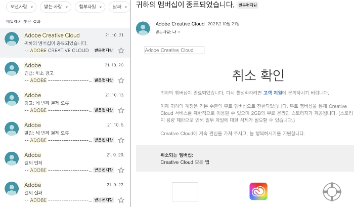 저는 어도비가 결제 못하도록 계좌에 돈 안 넣어놓는 것도 지겨워서 취소한 다음에 계정을 아예 삭제해버렸습니다.