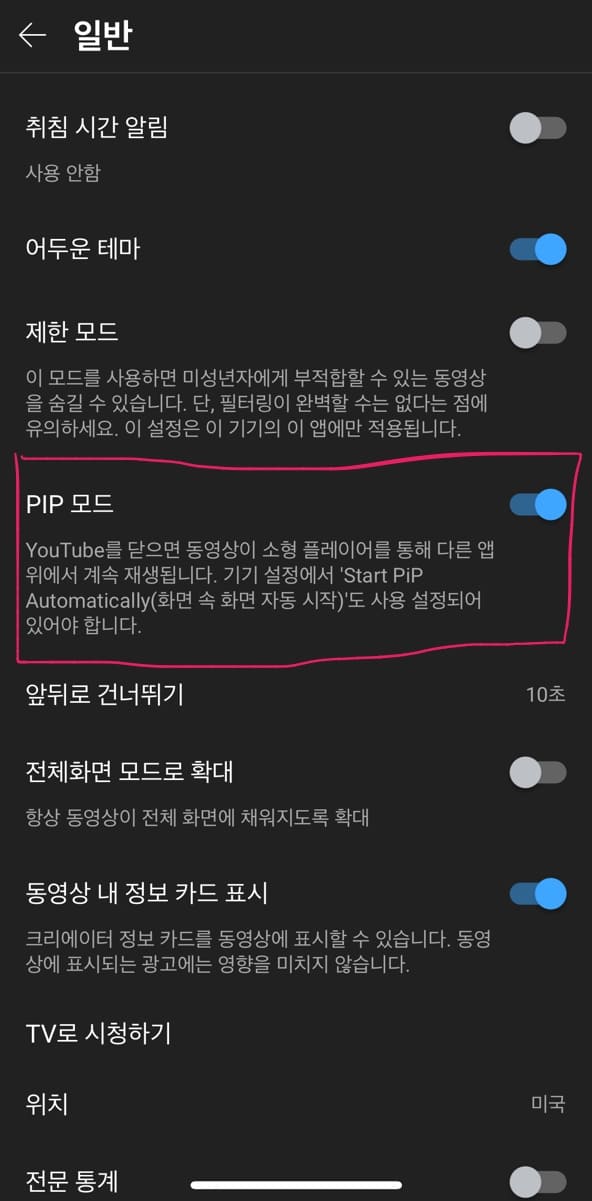 이 기능은 <설정> - <일반> - <PIP 모드>에서 확인할 수 있다.
