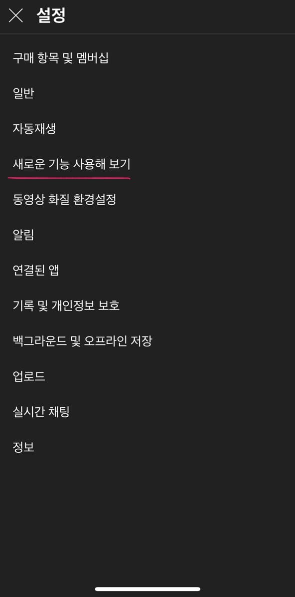 유튜브 앱의 <설정>으로 들어가서 <새로운 기능 사용해 보기>로 들어간 다음, iOS의 PIP 모드 왼쪽 밑의 <직접 해보기>를 누른다. 사진에서는 이미 눌러놨기 때문에 사용 안함 버튼으로 바뀌어있다.
