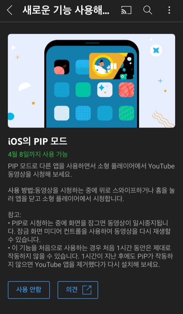 기능이 바로 적용 되는 건 아니고, 1시간 동안은 제대로 작동하지 않을 수 있다고 한다. 1시간이 지난 후에도 PiP가 작동하지 않으면 앱을 제거했다가 다시 설치해보라고 했는데, 성격이 급해서 바로 삭제했다가 다시 설치해줬다.