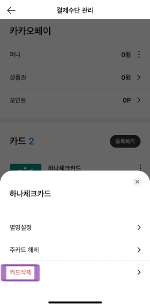 이미 등록되어 있는 카드 오른쪽의 점 세 개를 눌러서 '별명 설정', '주 카드 해제', '카드 삭제'가 가능합니다.