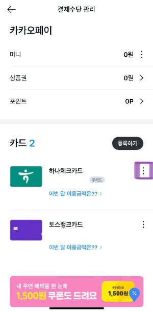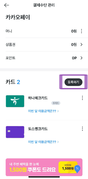 그러면 결제수단 관리 화면에서 카드를 등록하거나,