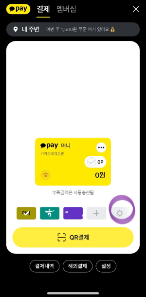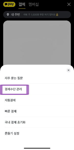 회색 톱니바퀴를 누르면 결제수단 관리 화면이 나옵니다.