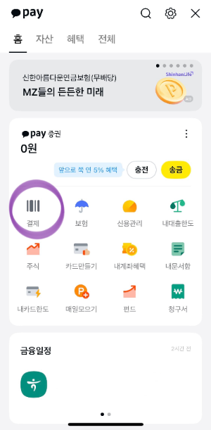 결제 수단을 변경하는 두 번째 방법은 pay 화면에서 화면 가운데 왼쪽에 있는 결제를 누르는 것입니다.