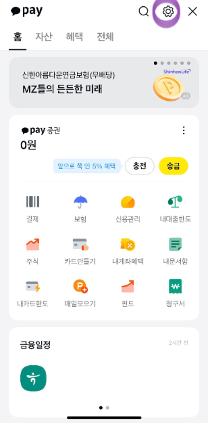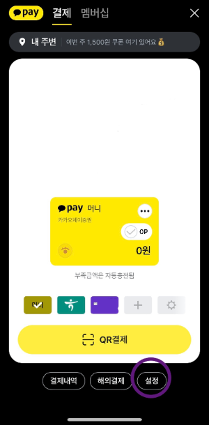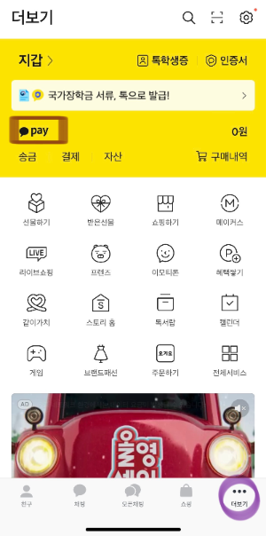 카카오톡에 들어가서 맨 오른쪽 밑의 더보기를 누르면 보이는 화면에서 pay를 눌러주세요.