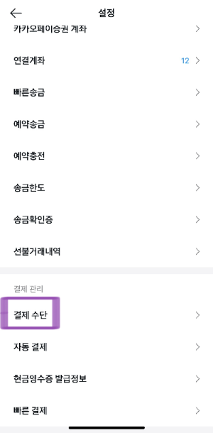 그리고 밑으로 화면을 내려서 결제 수단을 눌러주세요.