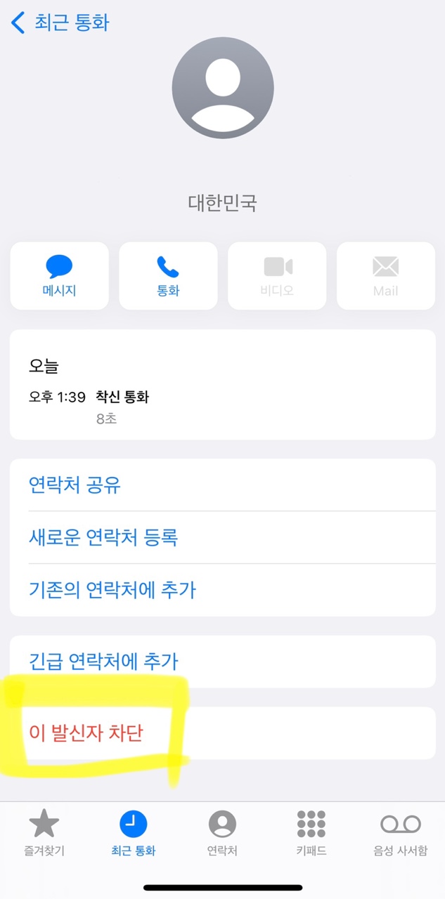 맨 밑에 있는 이 발신자 차단을 누른다.