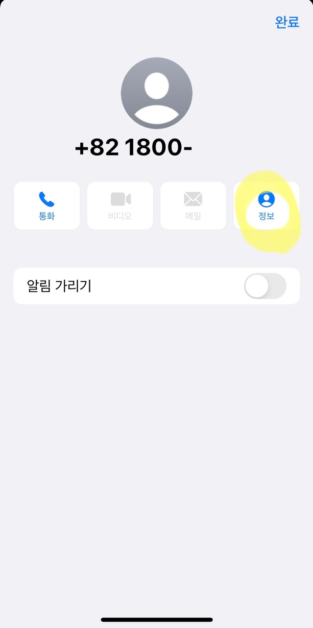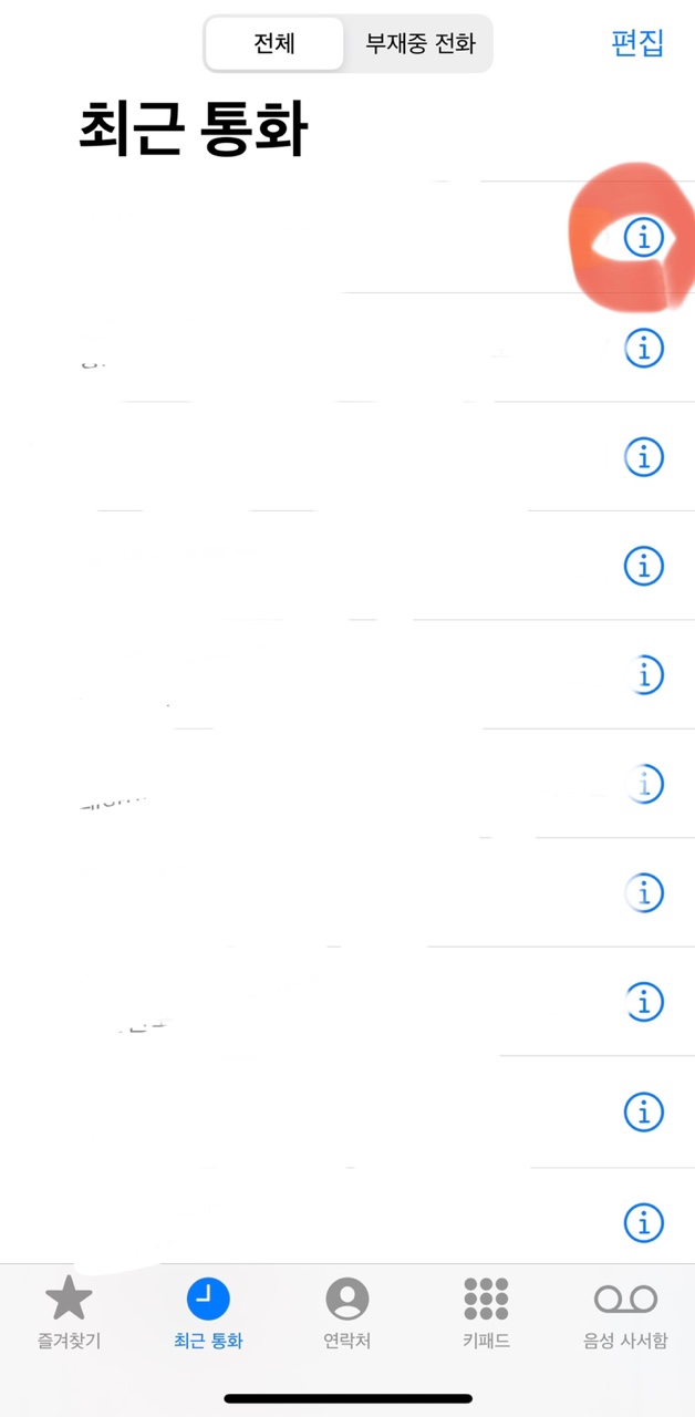 방금 온 광고 전화를 차단할거다. 전화 앱에 들어가서 최근 통화의 전화번호 오른쪽에 있는 i를 누른다.