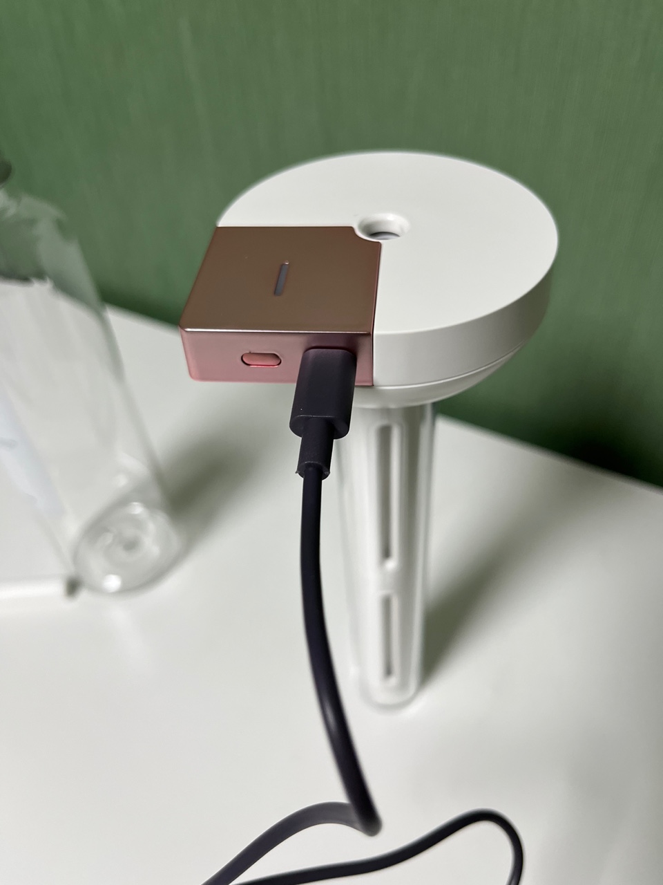 가습기의 전원버튼 옆에 C핀 충전선를 꽂고 반대편은 usb는 충전기에 꽂았다. 충전이 시작되면 빨간 불이 들어오고 완료되면 초록불이 들어온다.