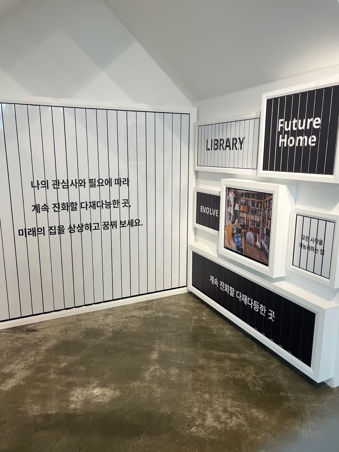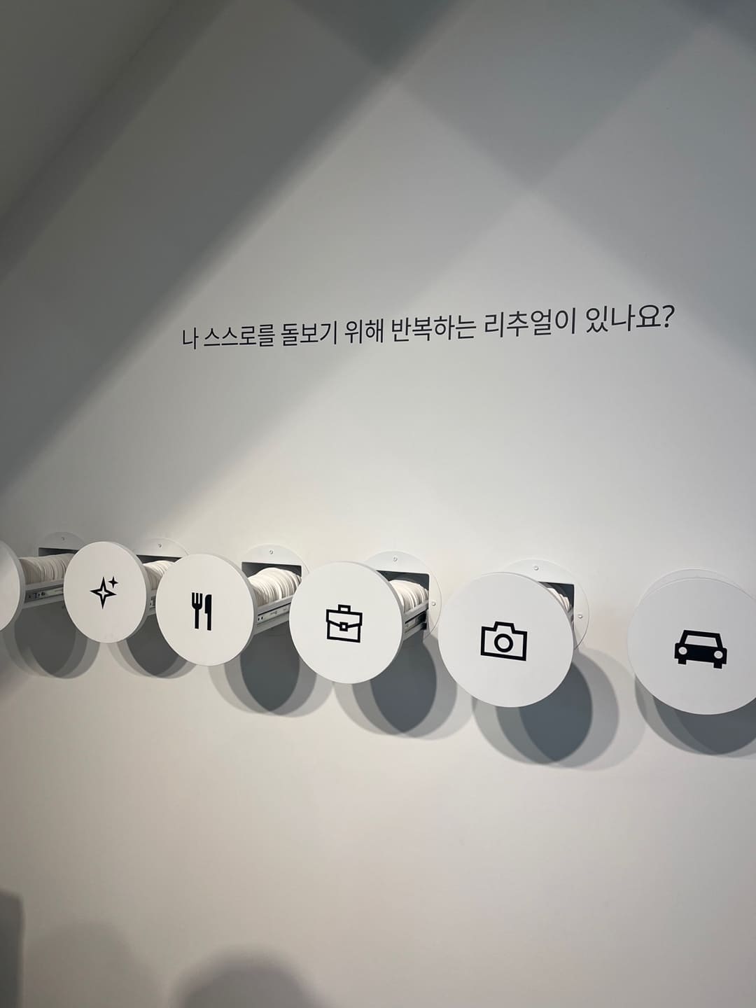 미래의 집은 어떤 모습일지 생각해보게 하는 곳, 집에서 나 스스로를 돌보기 위해 반복하는 리추얼을 적어보게 하는 곳이 있었다. 사람들이 뭐라고 적었는지도 좀 봤는데, 카테고리별로 다양하게 적혀 있었다. 어떤 사람은 건강을 챙기기 위해 숨쉬기 운동을 한다고 적었고, 어떤 사람은 반려동물 데리고 산책하는 걸 적었고, 또 어떤 사람은 매일 샐러드 챙겨먹는 루틴을 적어놨다. 나도 뭔가 적고 싶었는데 내가 뭘 하는 지 잘 모르겠어서 못 적었다.