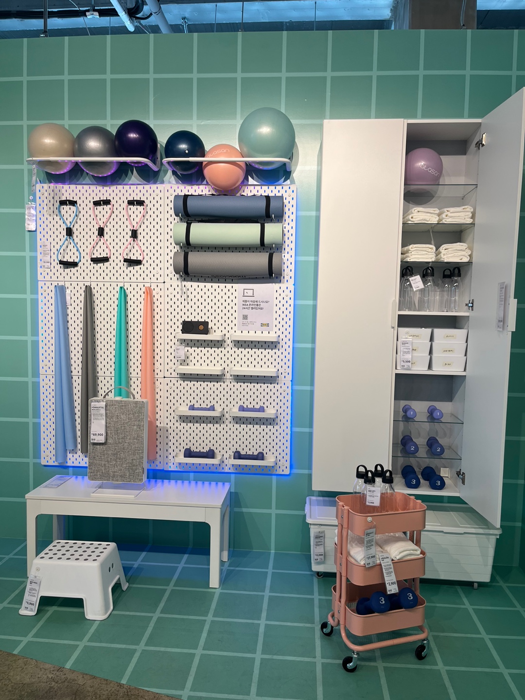 운동기구도 깔끔하게 정리할 수 있다는 걸 보고 감탄했다. 수납장에 넣을 바구니에 마스킹테이프 붙여두고 이름 써놓은 게 좋은 아이디어인 것 같다. 나도 집에 적용해봐야겠다. 공기청정기도 팔던데 표면이 천이어서 저게 어떻게 분리될 지 궁금했다.