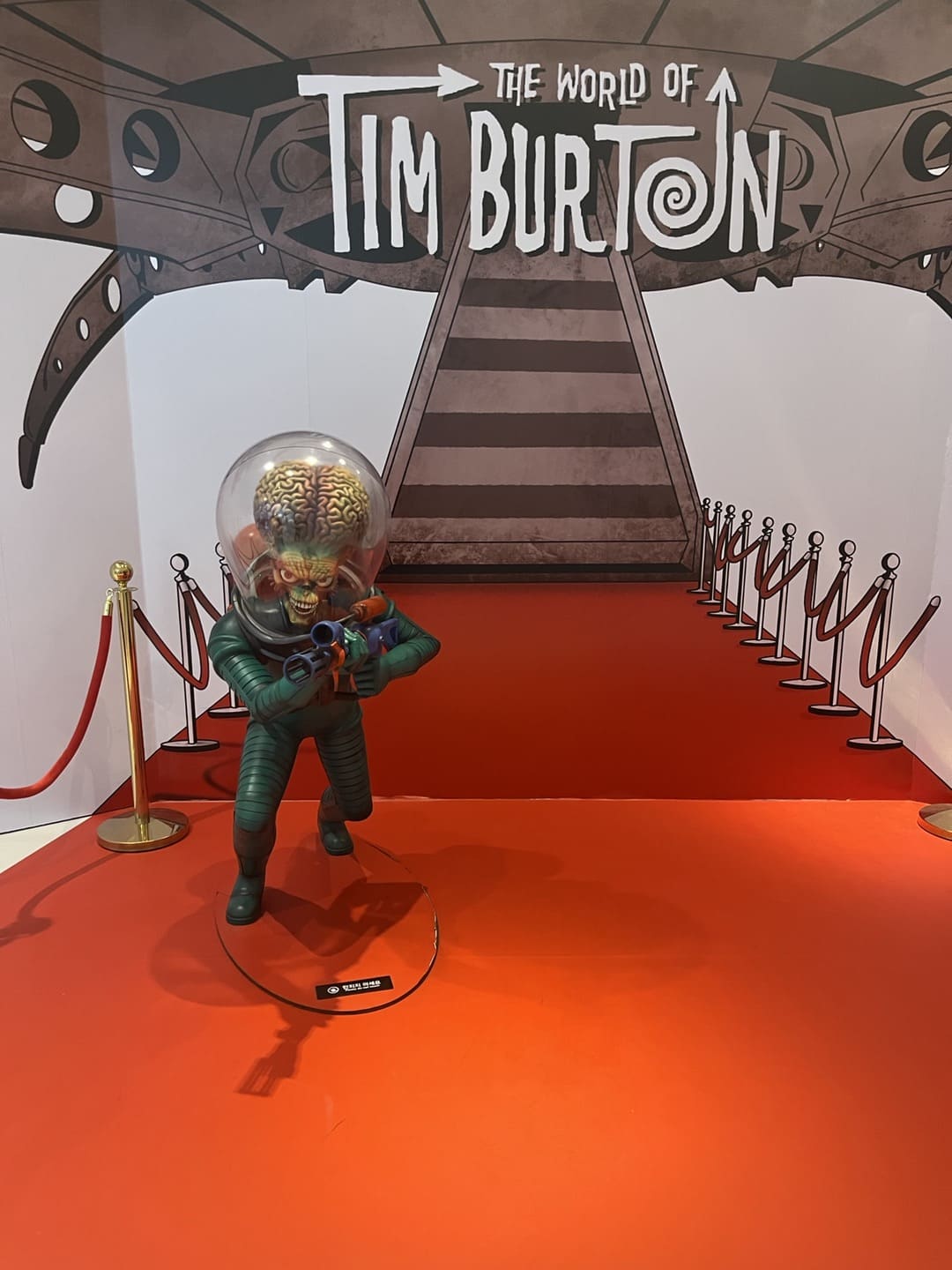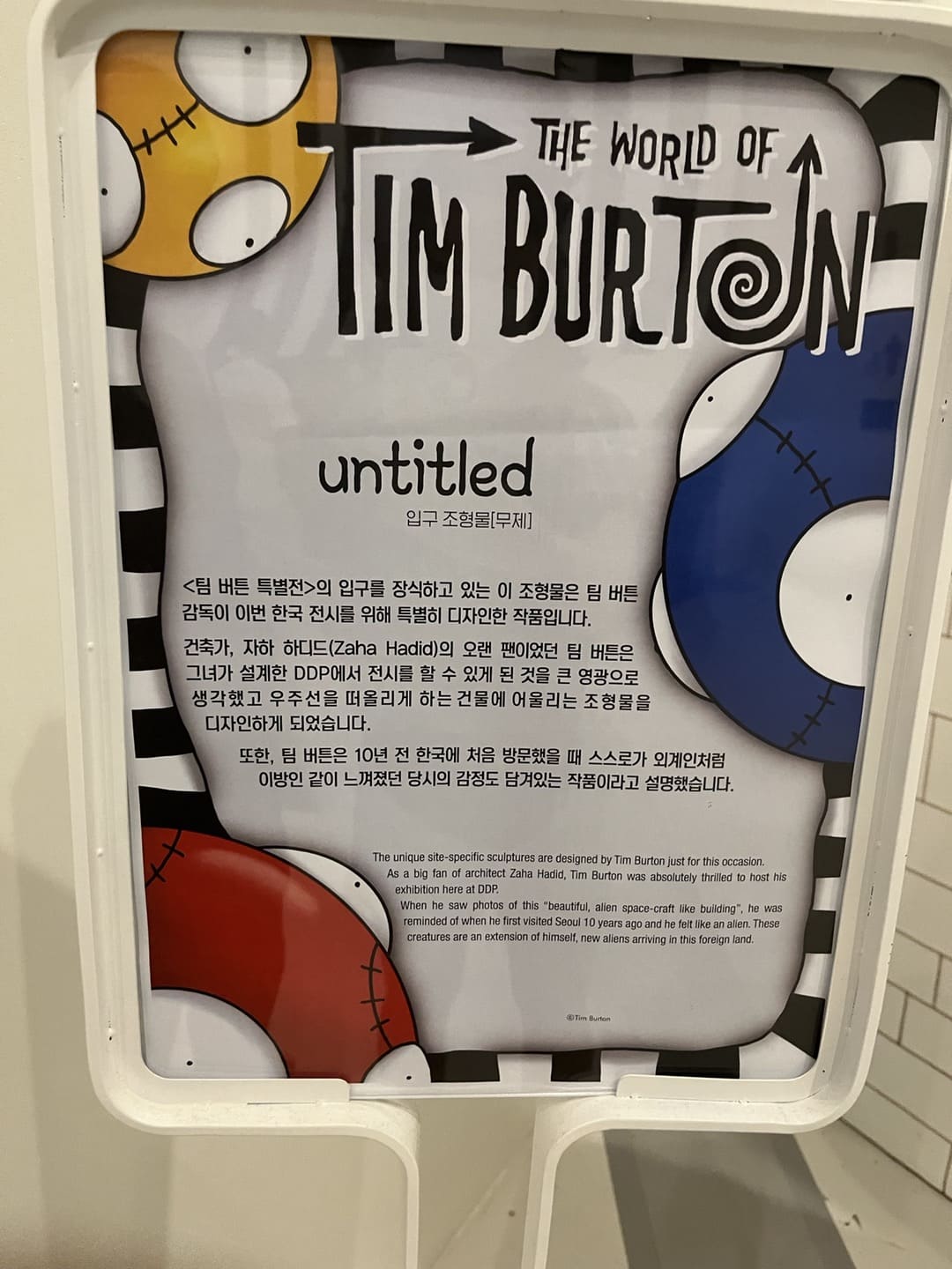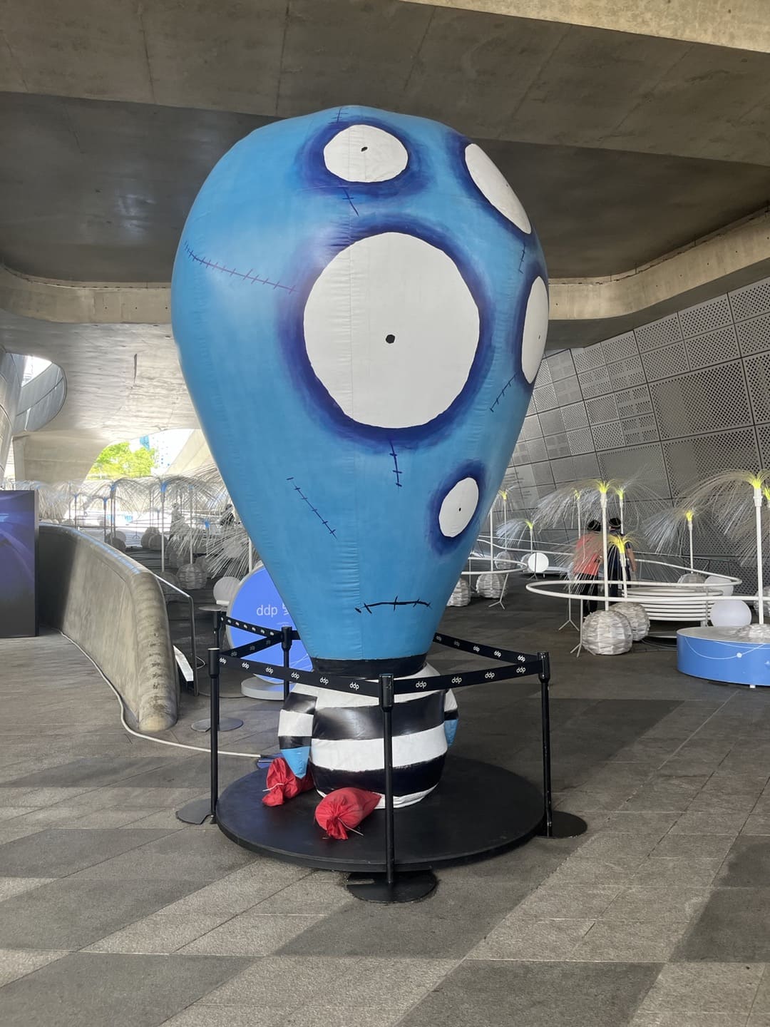 ddp 건축가인 자하 하디드의 팬이었던 팀 버튼이 우주선을 떠올리게 하는 이 건물에 어울리게 창작한 외계인 조형물이라고 한다. 스스로가 외계인처럼 이방인 같이 느껴졌던 당시의 감정도 담겨있는 작품이라고 했다.