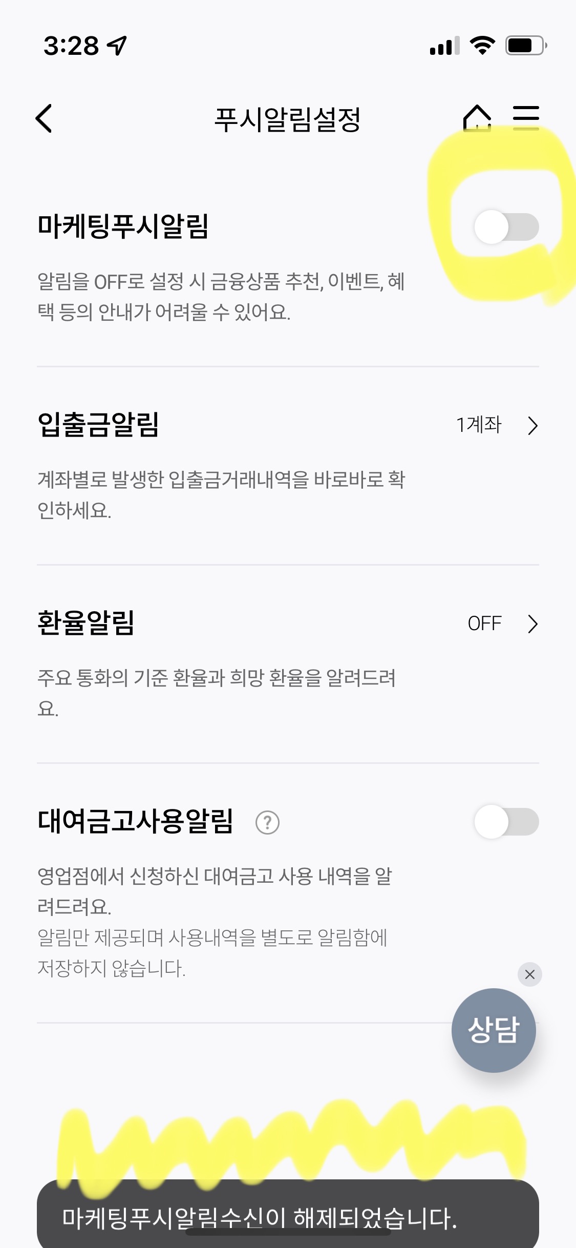 회색으로 바뀌고 화면 밑부분에 '마케팅푸시알림수신이 해제되었습니다.'라는 문장이 뜨면서 끝