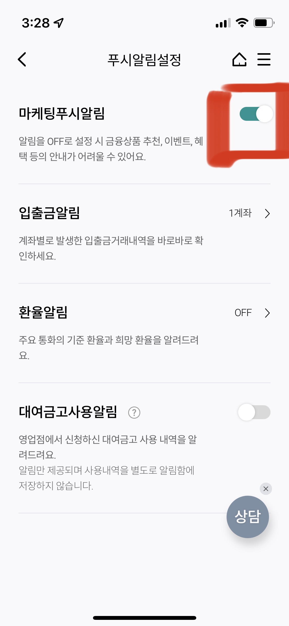 마케팅푸시알림의 파란 부분을 누르면